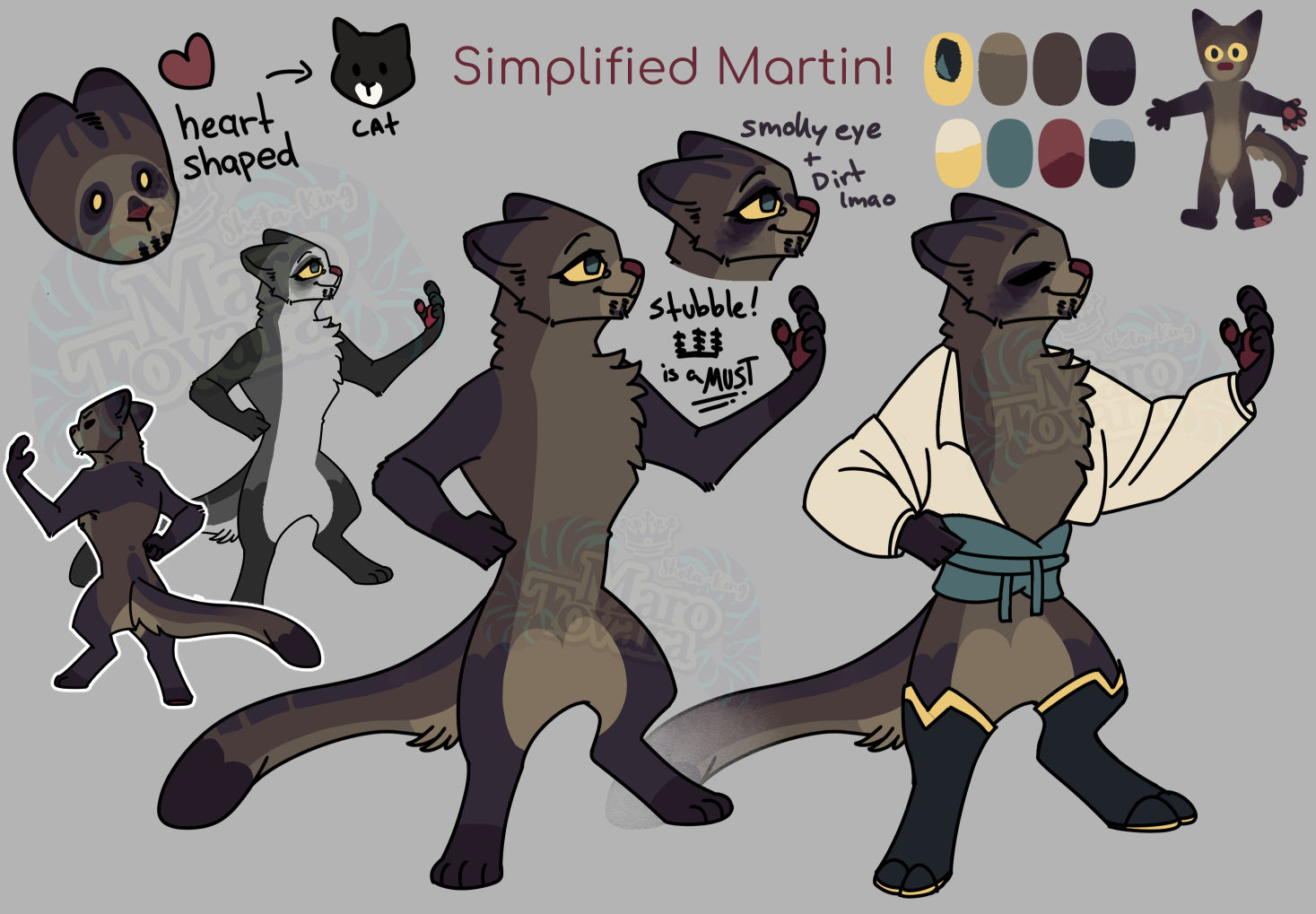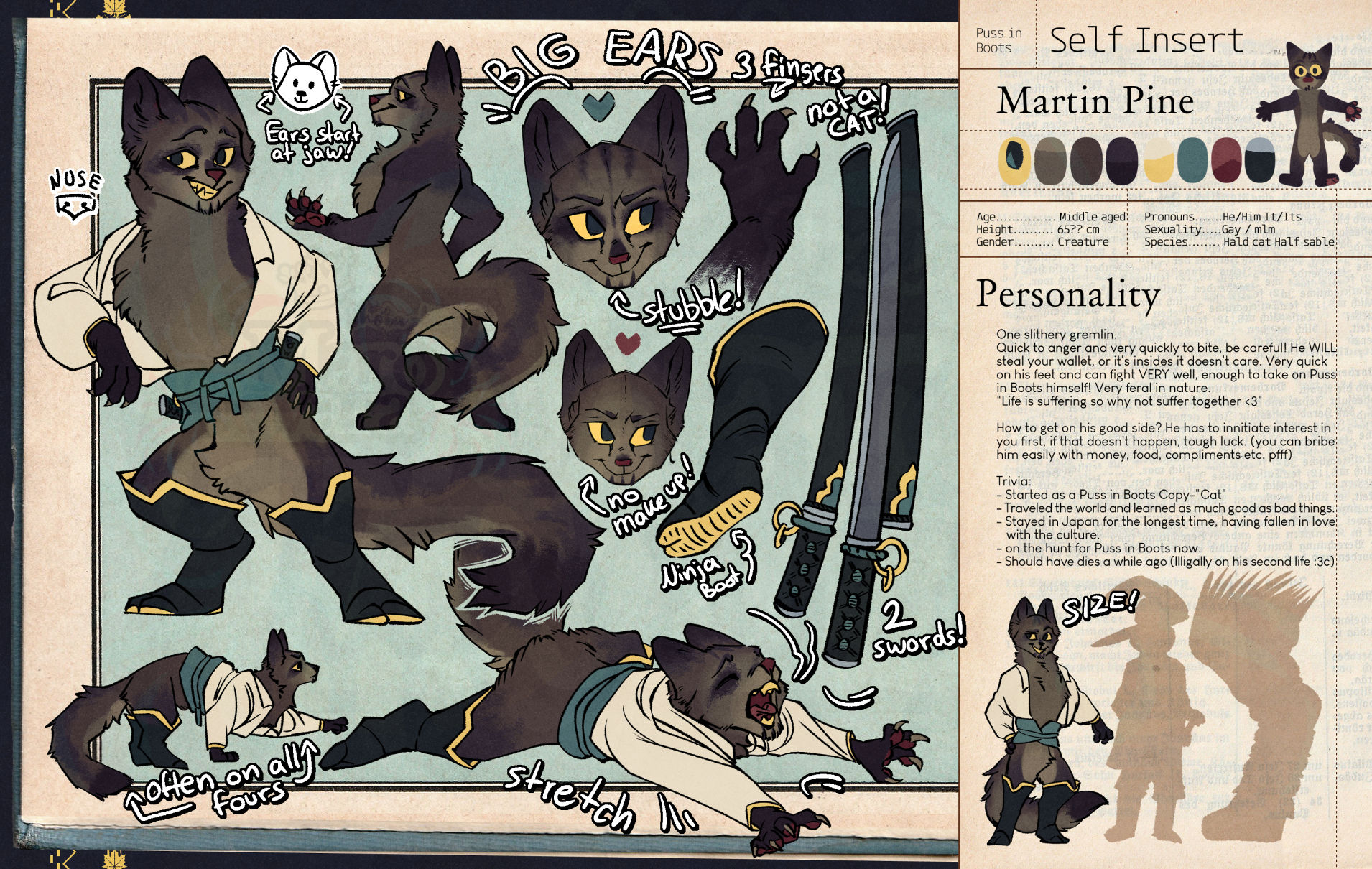 Martin grew up protected and loved by his single mother, his sable dad had run off somewhere. He grew up near the place where puss in boots grew up, Martin watched his adventures and became a big fan of the cat to the point of mimicking him! His mother even got a nice pair of boots for him!